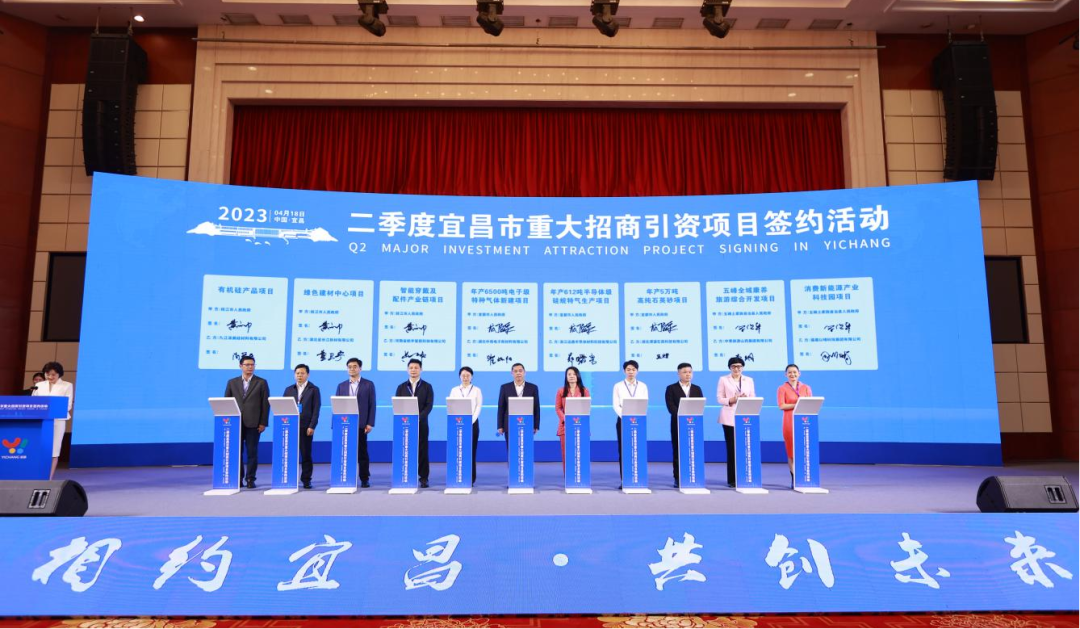 4月18日上午,2023年二季度宜昌市重大项目招商引资活动签约仪式在宜昌市桃花岭饭店隆重举行。长江新材公司党委书记、董事长童卫宁出席签约仪式,分别与枝江市委副书记、市长黄芳帅签约枝江绿色建材产业园项目,与夷陵区委副书记、区长李兴兵签约玄武岩纤维复合新材料产业园项目,两大项目合计总投资额达47亿元。