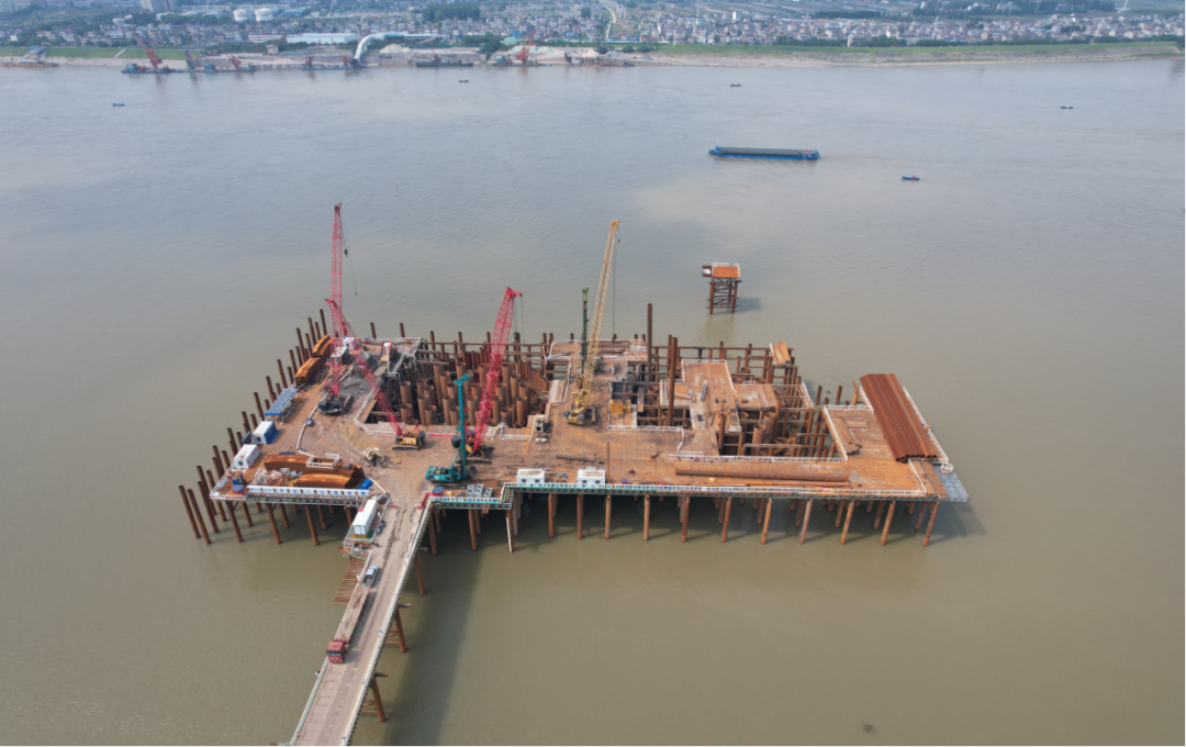 〔图:当枝松高速枝江长江大桥建设场景〕