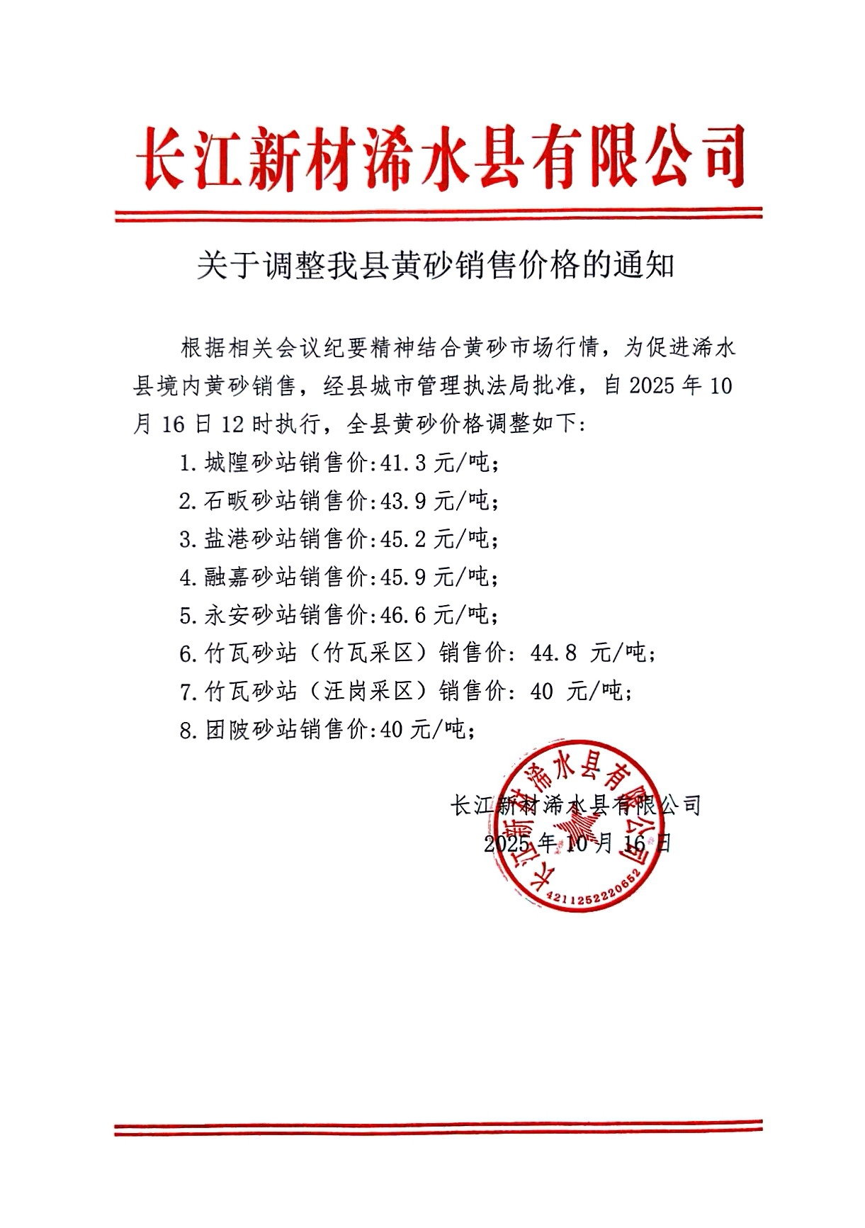 长江新材浠水县有限公司关于调整我县黄砂销售价格的公告