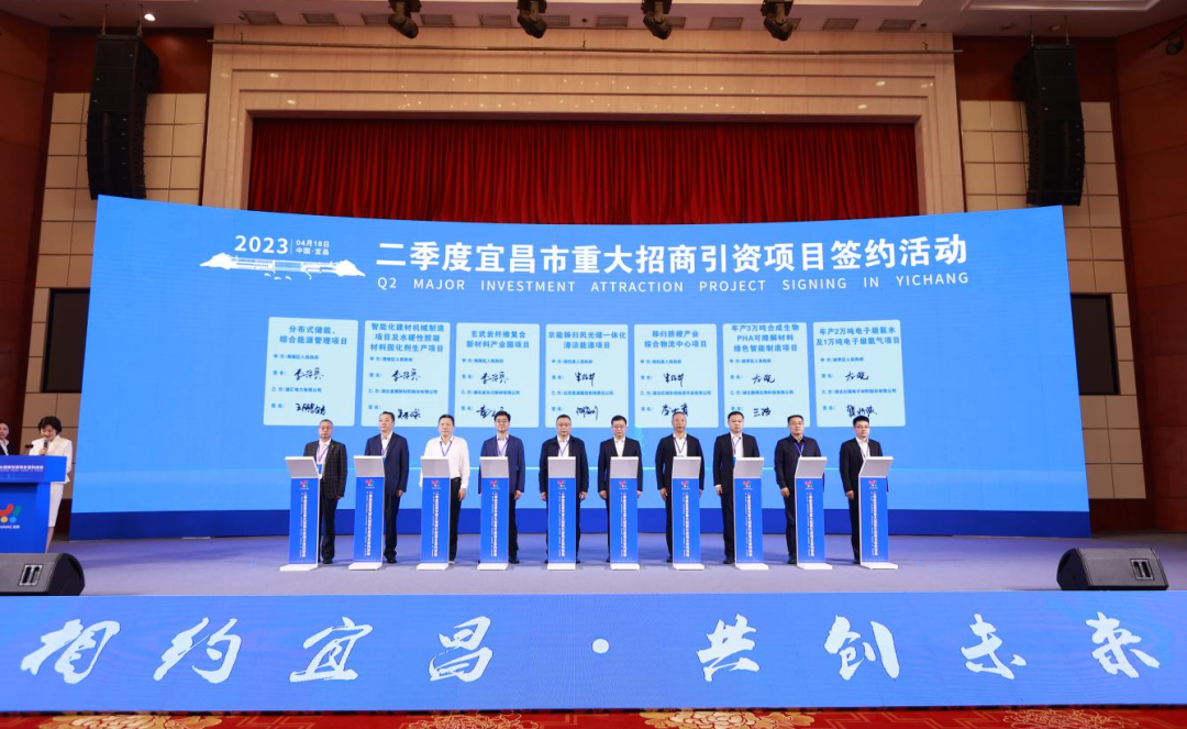 4月18日上午,2023年二季度宜昌市重大项目招商引资活动签约仪式在宜昌市桃花岭饭店隆重举行。长江新材公司党委书记、董事长童卫宁出席签约仪式,分别与枝江市委副书记、市长黄芳帅签约枝江绿色建材产业园项目,与夷陵区委副书记、区长李兴兵签约玄武岩纤维复合新材料产业园项目,两大项目合计总投资额达47亿元。