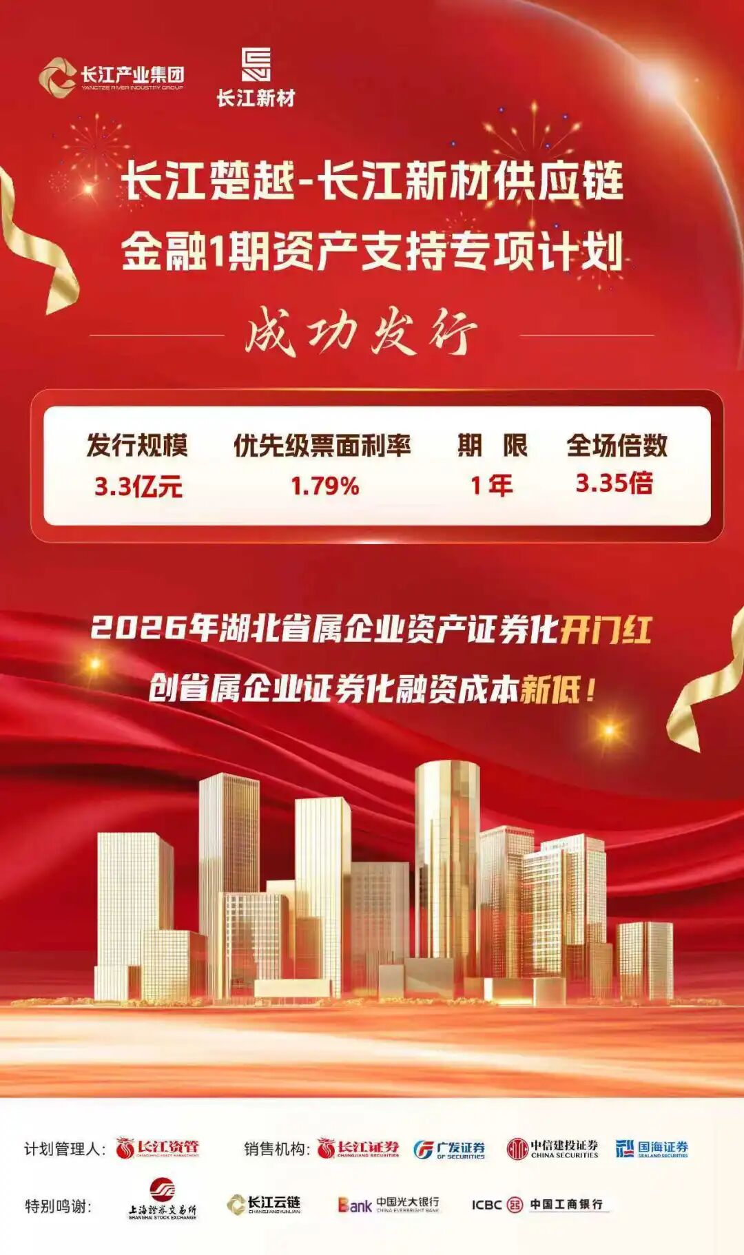 2月3日,湖北省长江新材有限公司(以下简称长江新材)供应链资产支持专项计划(供应链ABS)首期成功发行,规模3.3亿元,票面利率低至1.79%,认购倍数达3.35倍,创下全国同期限资产支持证券利率新低,同时也实现了2026年省属企业资产证券化业务“开门红”,标志着长江产业集团首单资产支持证券项目成功落地。