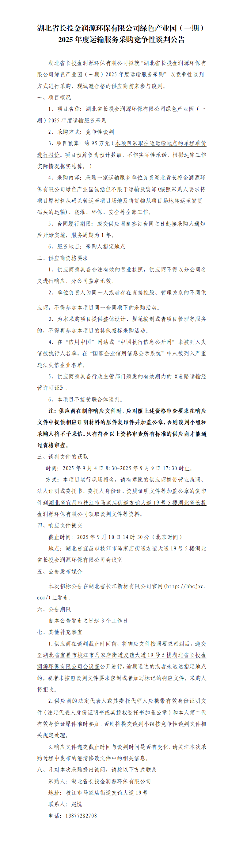 湖北省长投金润源环保有限公司绿色产业园(一期)2025年度运输服务采购竞争性谈判公告
