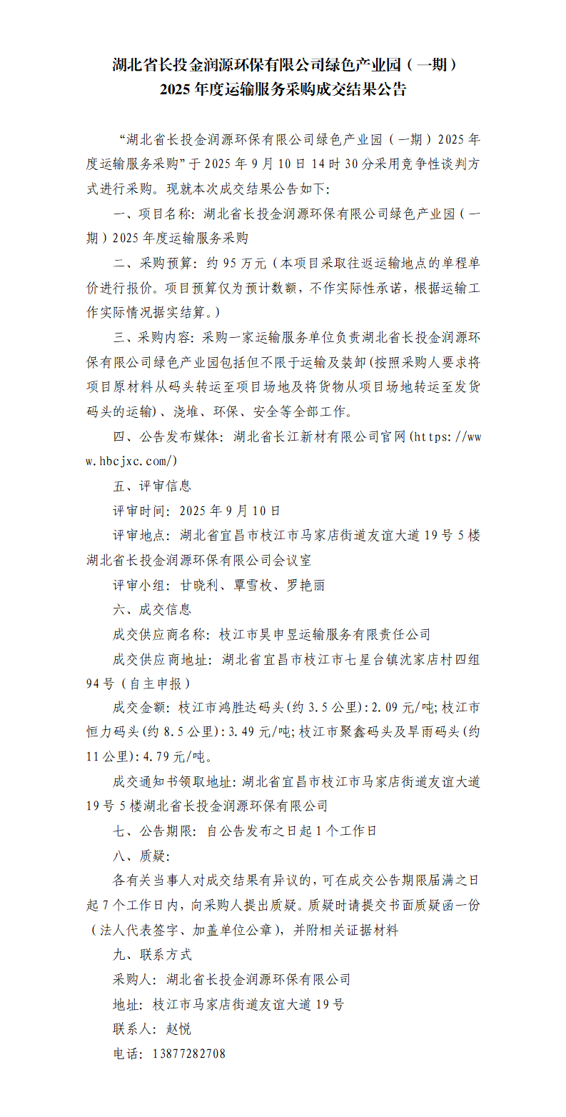 湖北省长投金润源环保有限公司绿色产业园(一期)2025年度运输服务采购成交结果公告